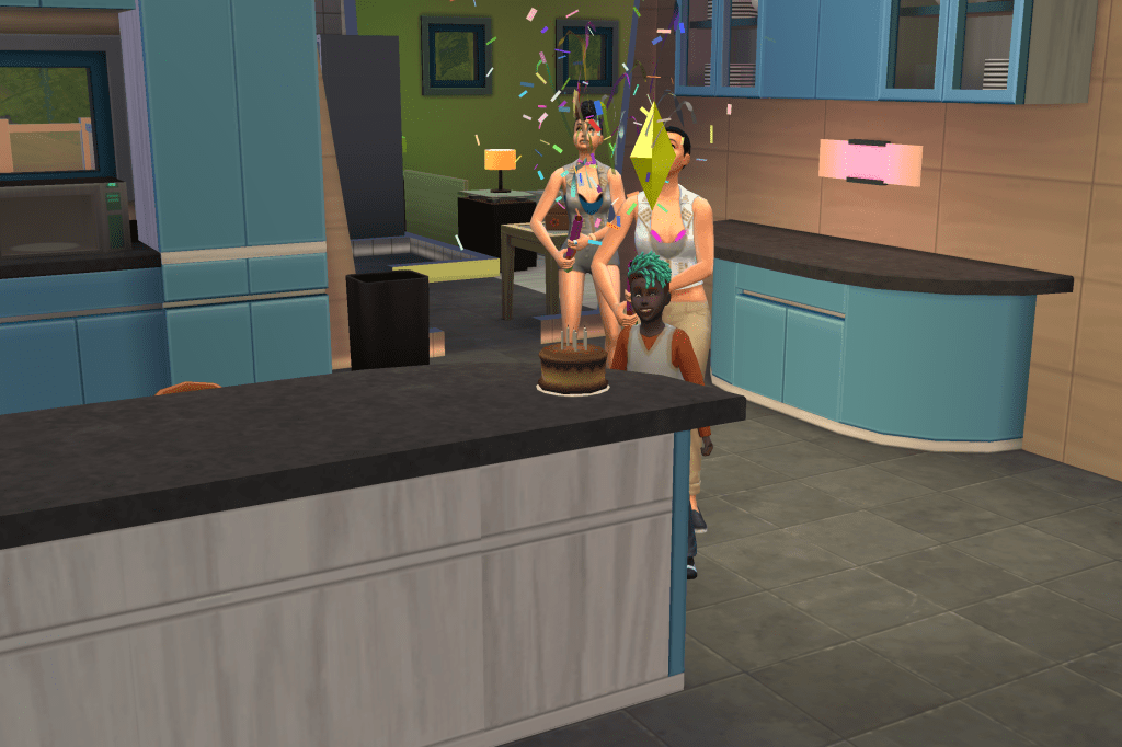 Today I threw a birthday party for my Sim child to age him into teenage-hood. I had to make an important decision: whether to bake him a chocolate, funfetti, or a simple white cake. I settled on chocolate as this indulgent option would be what I would choose to eat, and the picture looked most appetising.